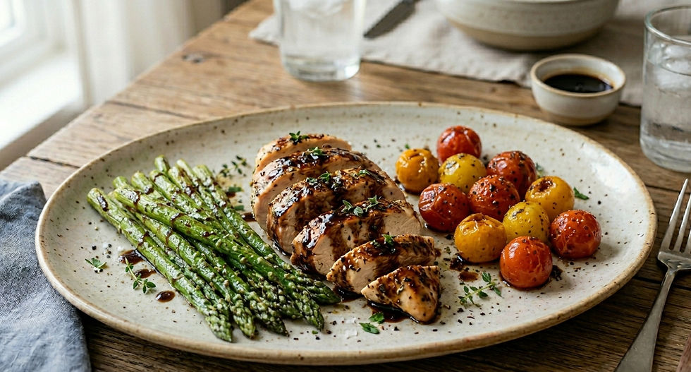Move veggies to one side, add chicken back in and pour in balsamic sauce. Mix into veggies and chicken, cook another 5 minutes.